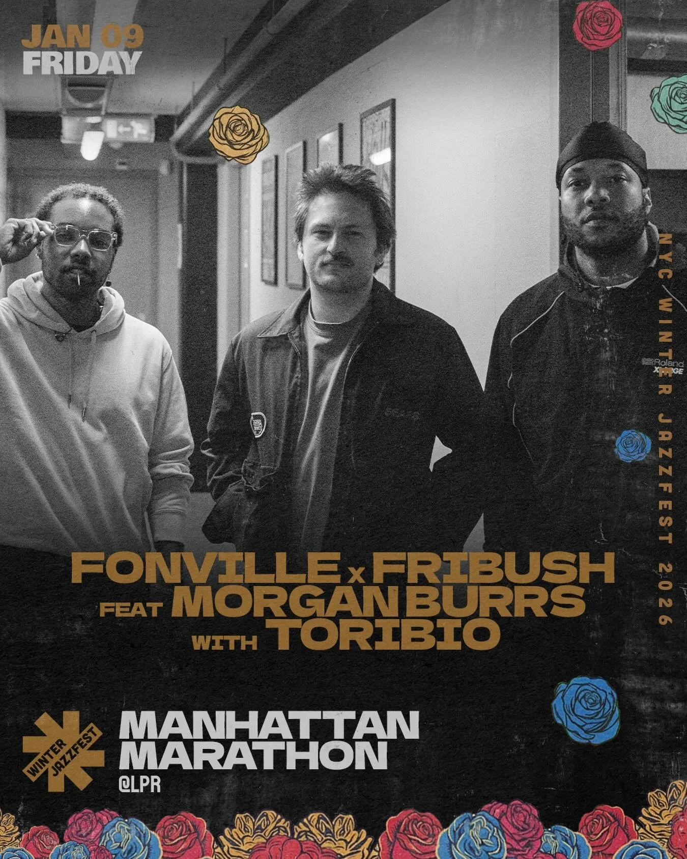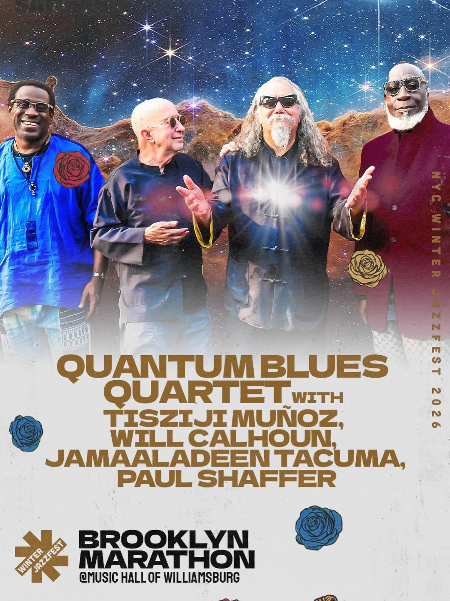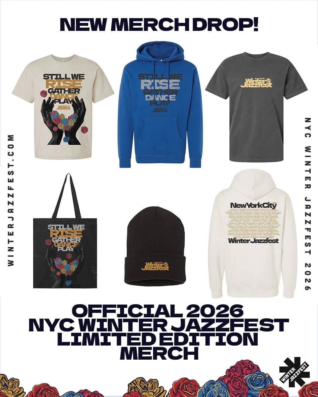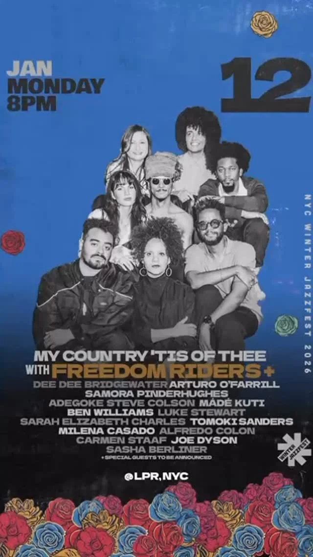 Our aesthetic pulls from the bold lines of political poster art, the brilliance of Afrofuturist visionaries, and the lush imagination of artists like Kerry James Marshall and Mati Klarwein. Flowers — especially roses — rise as symbols of beauty, protest, celebration, and mourning. They bloom as sound bursting from instruments, as threads weaving musicians together, as offerings of joy in defiance of silence. At the center: two hands rise up, cupped open — offering and receiving — just like jazz itself, a prayer carried on rhythm. As current powers attempt Black erasure, this festival centers Black American music, where protest is joy, music is power, and gathering is resilience.