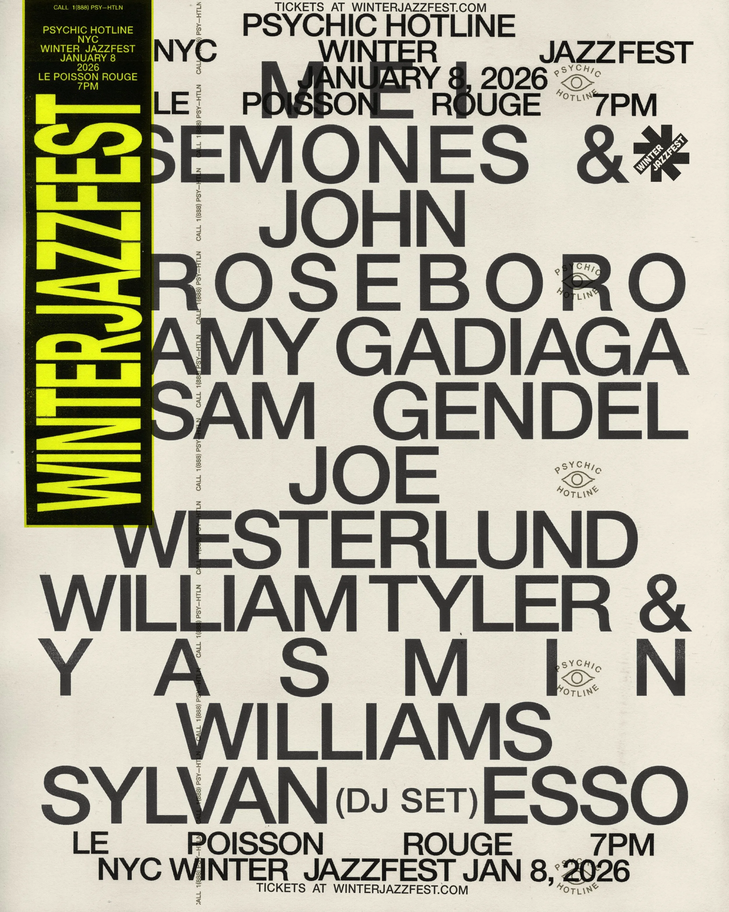 Winter Jazzfest partners with Durham-based record label Psychic Hotline for a label showcase that expands the conversation around jazz and its many intersections. Founded by Sylvan Esso’s Amelia Meath and Nick Sanborn with Martin Anderson, Psychic Hotline is an artist-run company built on radically artist-forward values: transparent deals, creative freedom, and an ever-growing community of voices. This showcase brings together adventurous music-makers across jazz, folk, and experimental traditions—Mei Semones & John Roseboro, Amy Gadiaga, Sam Gendel, Joe Westerlund, William Tyler & Yasmin Williams—plus a DJ set from Sylvan Esso. Winter Jazzfest has previously presented Psychic Hotline artists including Amaro Freitas, Sam Wilkes, and Gendel. This year’s showcase extends a warm genre-agnostic welcome to a label that celebrates our core values.